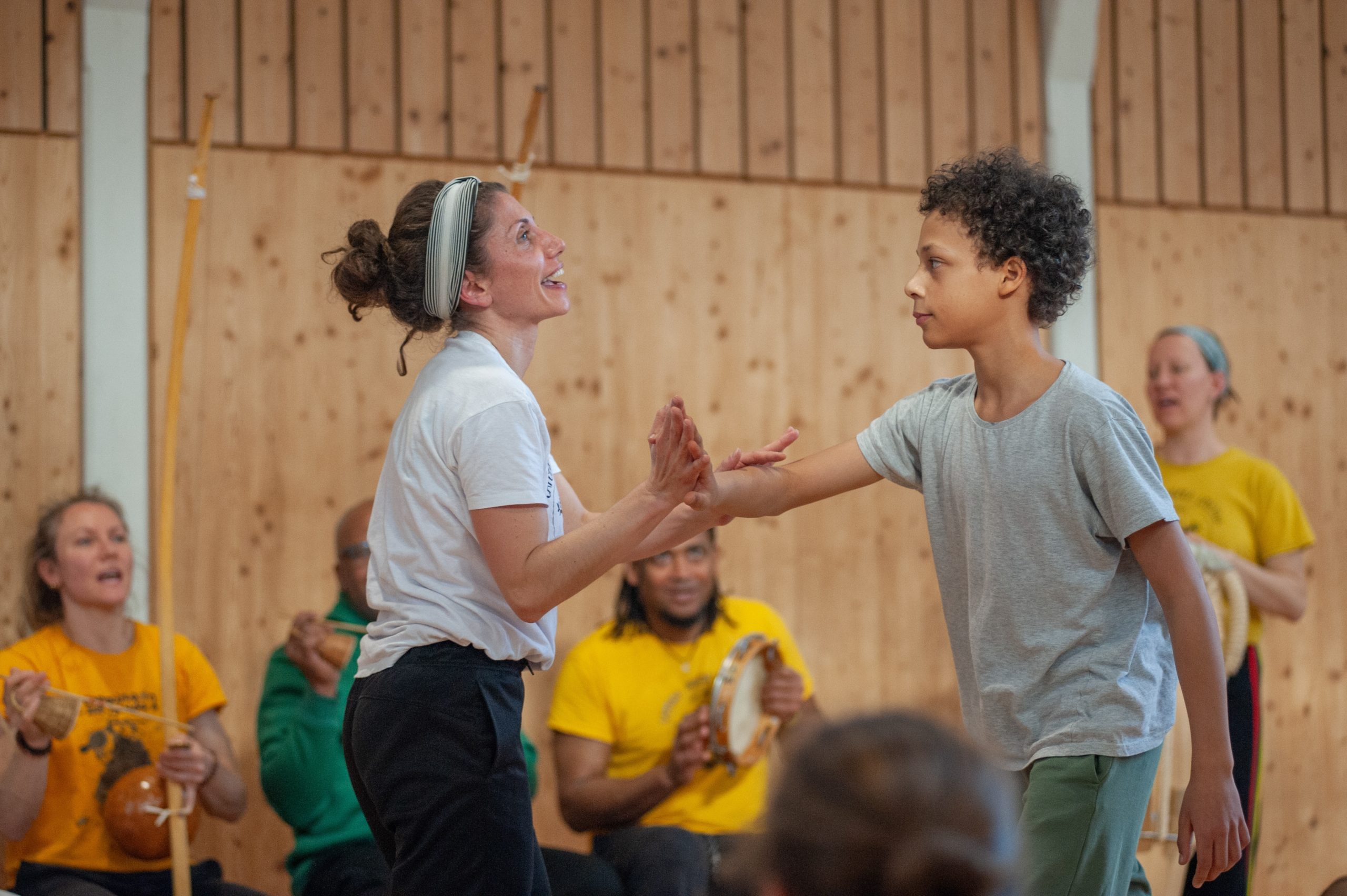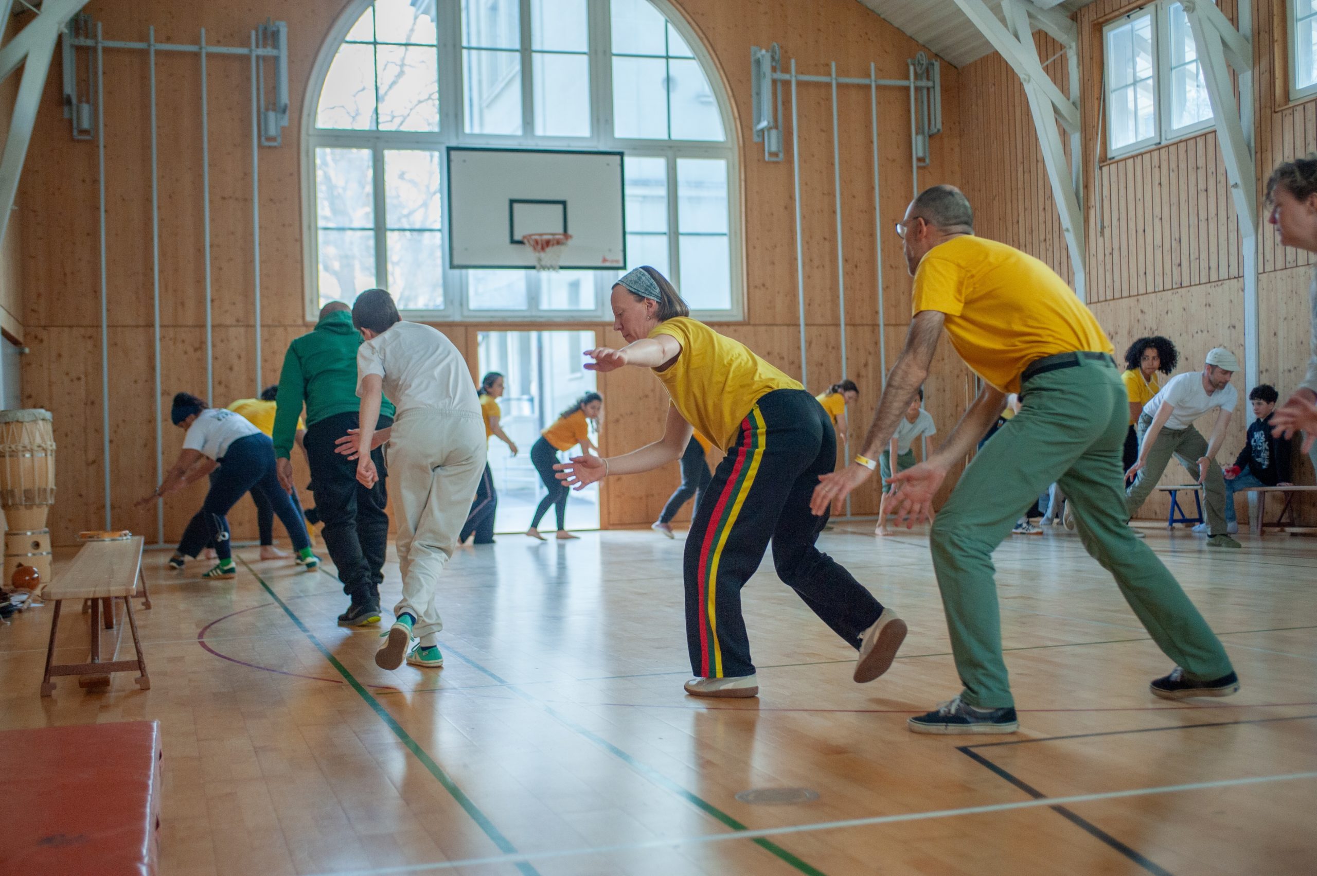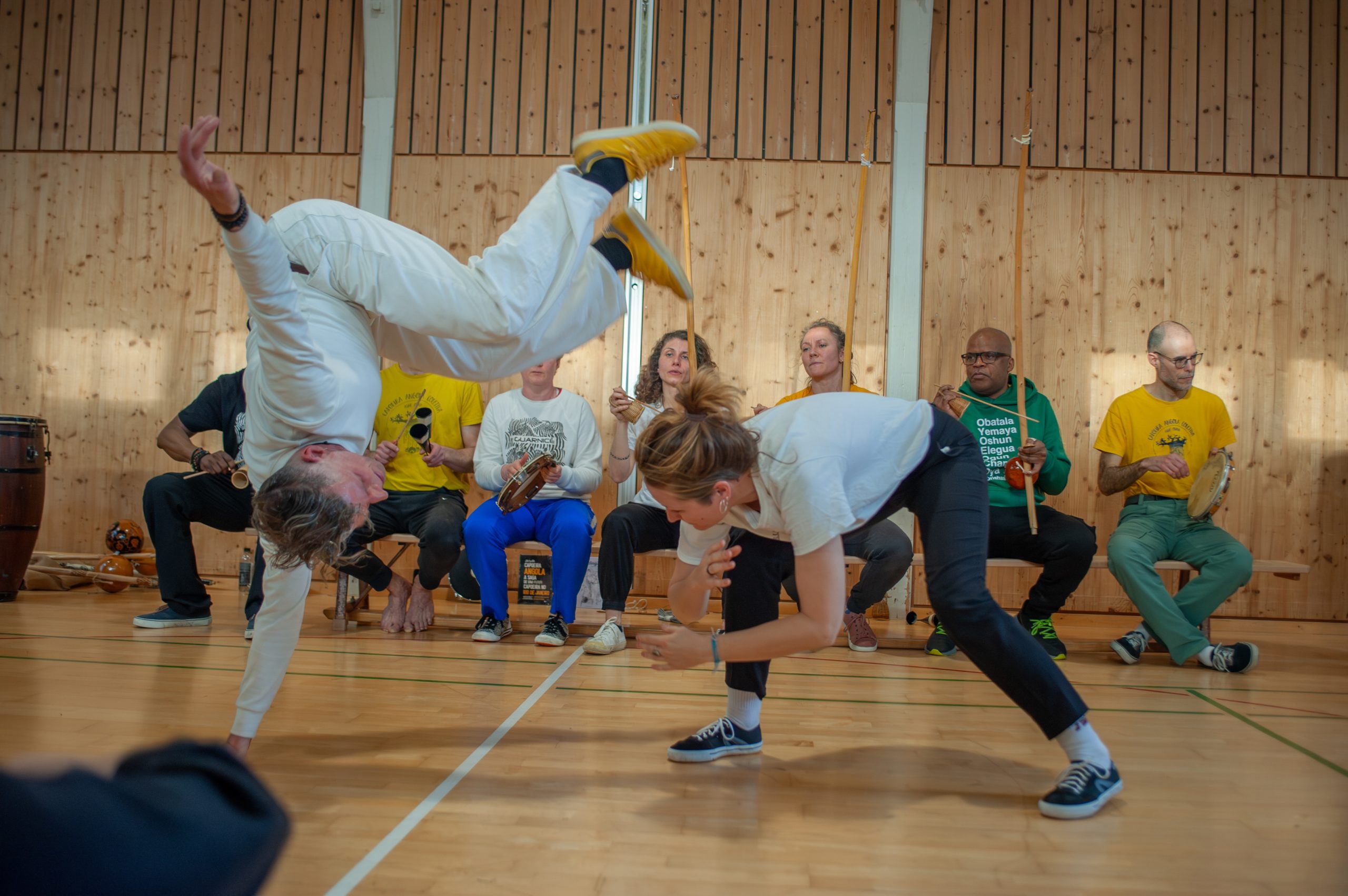 Im Kreis der Capoeiristas – Roda- begegnen sich zwei Spielende zu einer improvisierten Konversation. Sie gestalten ein Frage-Antwort-Spiel aus Angriff und Abwehr. Die Bewegungen stammen häufig aus der afrobrasilianischen Alltagswelt – sie symbolisieren den Kampf für Freiheit, Würde und Frieden. Begleitet und rhythmisiert wird das Jogo de Capoeira von der «Bateria» mit den Instrumenten Berimbau, Pandeiro, Atabaque, Agogo, Reco-reco und Gesang. Wir sehen die Roda als Ort des Ausdrucks unserer eigenen Mythen und Narrative. Unser Capoeira-Spiel ist freundschaftlich, humorvoll und theatralisch.
